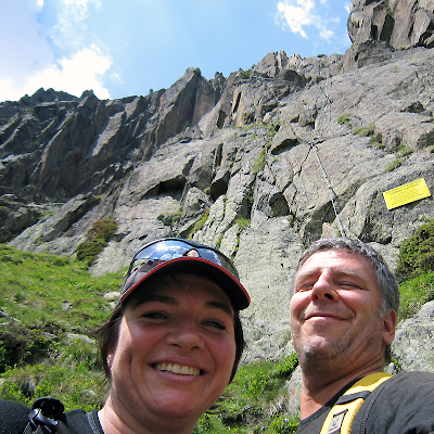 Ein paar Steinwürfe von "Hütte" und Mittelstation entfernt sind dann zwei Klettersteige, Fernau (für Familien) und Fernau Express (für mich). Der letztere ist mit zurückzulegenden 120 Höhenmetern relativ niedrig angesiedelt, hat aber außer dem Stahlseil fast gar keine metallenen Helferlein. Der plattige Granit war für mich klettertechnisch Neuland. Ist aber wesentlich weniger brüchig als der gewohnte Martinswand-Kalk. Die senkrechten Wandplatten, das dünnere Stahlseil, die knackigen Überhänge und Kamine haben dann aber doch meinen Puls deutlich über den Fettverbrennungs-Bereich gebracht.